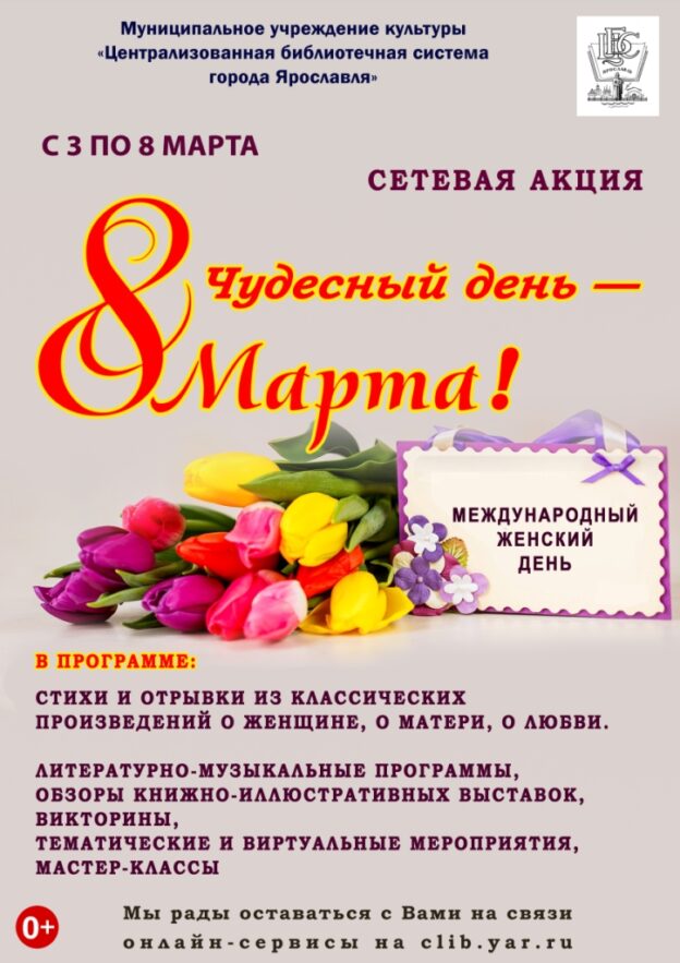 С 3 по 8 марта 2022 года сотрудники Централизованной библиотечной системы города Ярославля организуют цикл тематических мероприятий в рамках сетевой акции «Чудесный день — 8 Марта!».