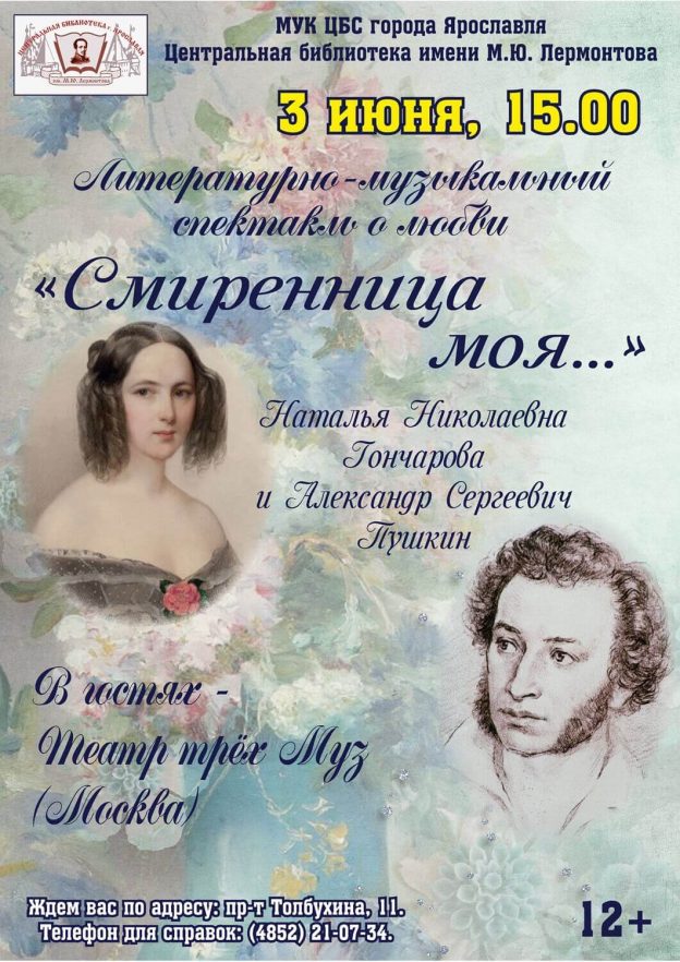 3 июня в 15:00 в Центральной библиотеке имени М. Ю. Лермонтова состоится литературно-музыкальный спектакль о любви «Смиренница моя…» в исполнении Театра трёх Муз (Москва).