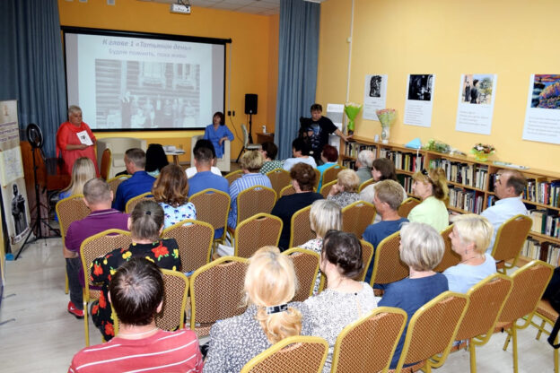 Рассказ сопровождала видеопрезентация, в которую вошло много снимков из книги, в том числе архивные и школьные фотографии Елены Вячеславовны и ее одноклассников, ее студенческие и семейные фото.