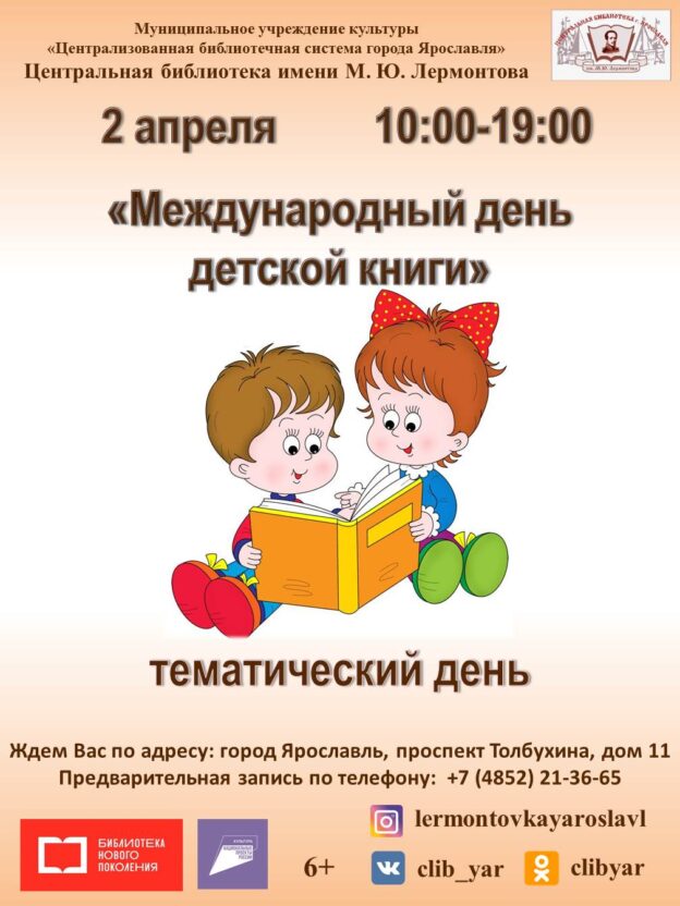 В Международный день детской книги 2 апреля с 10:00 до 19:00 в Центральной библиотеке имени М. Ю. Лермонтова пройдет тематический день, посвящённый этому празднику.