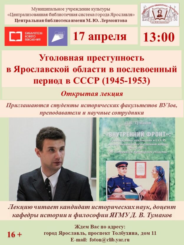 17 апреля в 13:00 Центральная библиотека имени М. Ю. Лермонтова приглашает на открытую лекцию «Уголовная преступность в Ярославской области в послевоенный период в СССР (1945–1953) по архивным документам МВД и партийных организаций» в рамках цикла «Военная история России XX века: малоизвестные страницы».