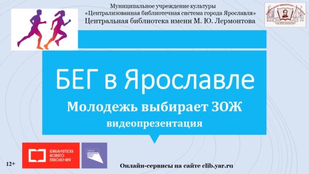 К сетевой акции «Здоровое поколение — ориентир XXI века» Центральная библиотека имени М. Ю. Лермонтова представляет видеопрезентацию «Бег в Ярославле. Молодёжь выбирает ЗОЖ» в рамках Всероссийского месячника антинаркотической направленности и популяризации здорового образа жизни.