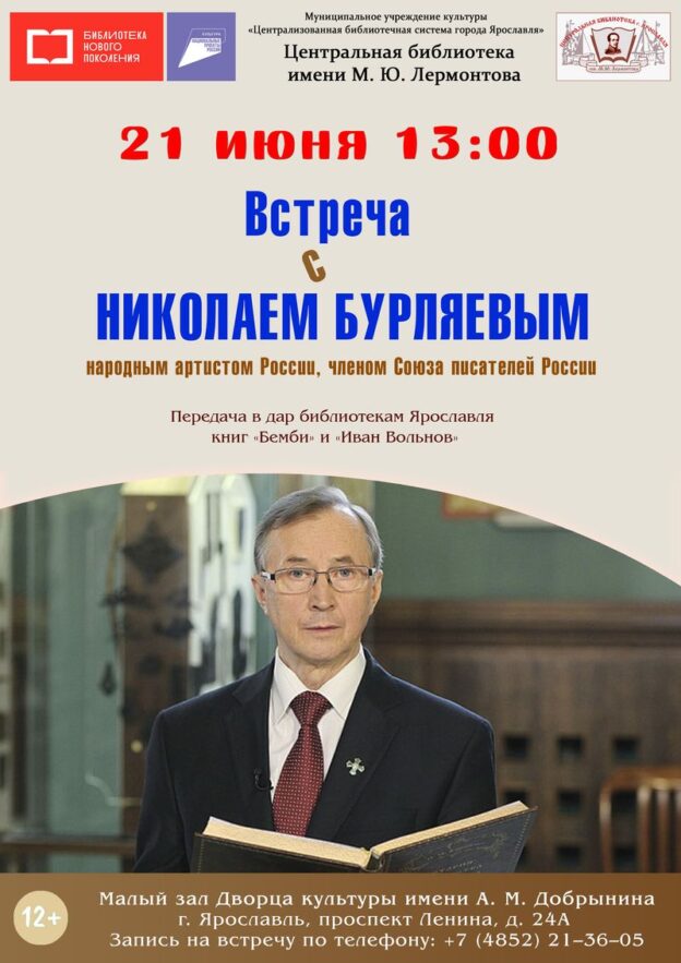 21 июня в 13:00 в Малом зале Дворца культуры имени А. М. Добрынина состоится встреча с народным артистом России, членом Союза писателей России Николаем Петровичем Бурляевым.