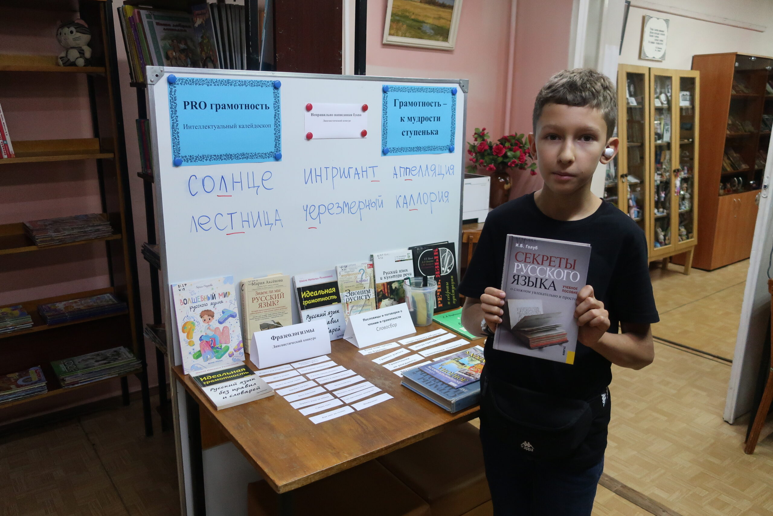 Библиотекари подготовили выставку «Грамотность — к мудрости ступенька». Читатели не смогли пройти мимо таких книг, как: «Волшебный мир русского языка» Ларисы Назаровой, «Знаем ли мы русский язык?» Марии Аксёновой, «Звонѝм русисту» Юлии Матийченко и «Русский язык и культура речи» Елены Буториной.