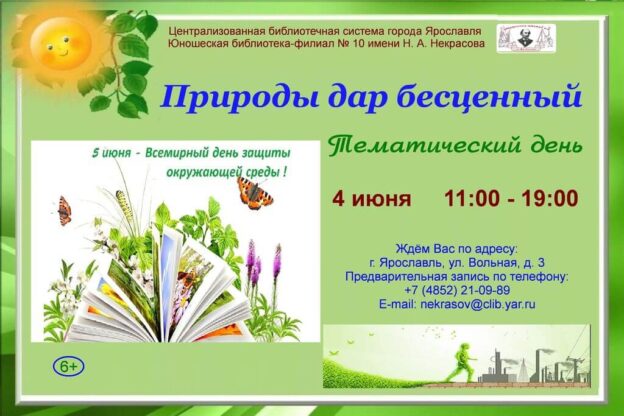 4 июня с 11:00 до 19:00 в Юношеской библиотеке-филиале № 10 имени Н. А. Некрасова пройдёт тематический день «Природы дар бесценный» в рамках сетевой акции «Человек. Природа. Экология» к Всемирному дню окружающей среды.